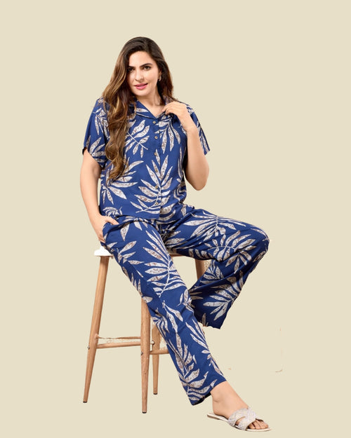 Navy Blue Tropical Leaf Print Pajama Set – Alpine Fabric