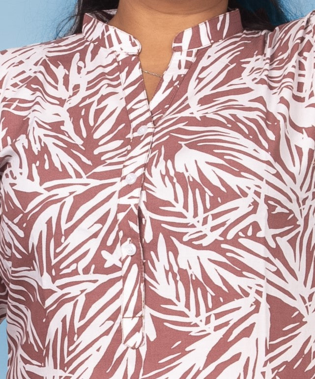 Unwind in style with this luxurious rayon night suit in a soothing mauve shade featuring a chic white leaf print. Designed for ultimate comfort and elegance, this nightwear is a must-have for cozy evenings and restful nights.
